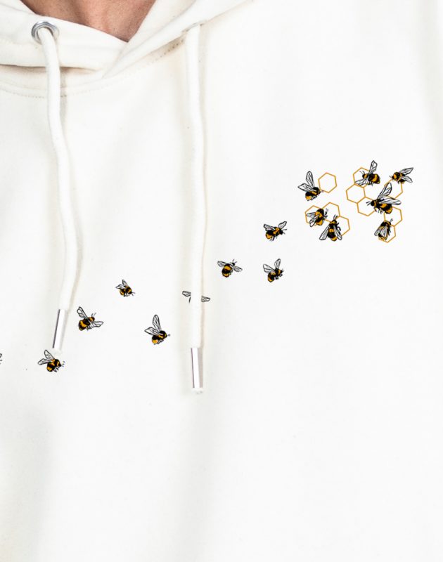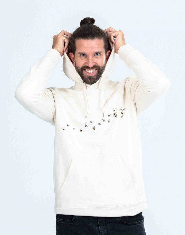 Dessuadora de 350gsm fabricada en 85% en cotó orgànic filat i pentinat i 15% de poliéster reciclat. Caputxa folrada amb teixit principal. Detalls metàl·lics en cordons. Puntada doble a punys i baix. Butxaca cangur.