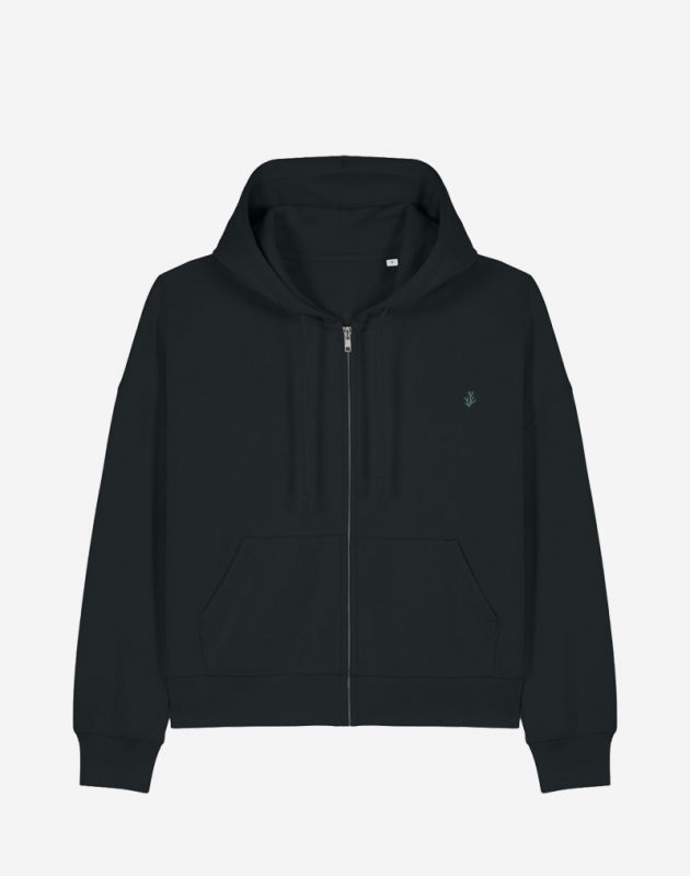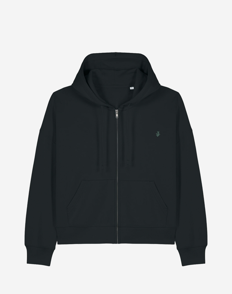 Dessuadora amb cremallera i caputxa de 300gsm feta 100% en cotó orgànic. Mànigues muntades i espatlles caigudes. Caputxa de doble capa amb cordó pla. Cremallera metàl·lica recoberta a la part central.